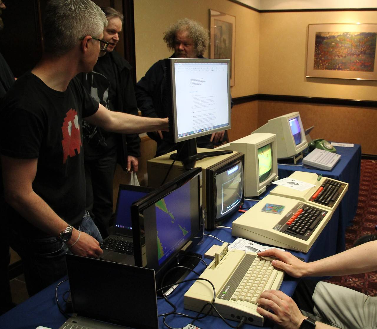 A technical discussion is going on here around the back of this row of Beebs. Furthest away, next to the GPO telephone, is an Acorn Communicator, which is the subject of a special feature here.