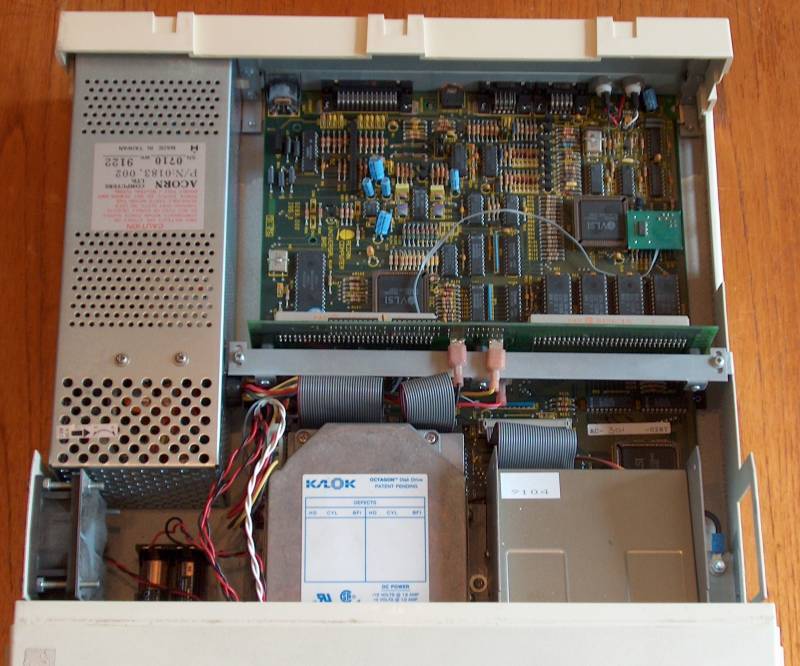 A bit closer and we can see the fan and battery pack to the bottom left as well as an unusual little board on the right-hand side of the main motherboard. I think this may be something to do with the "/1" in the computer title, which I believe refers to enhanced memory and video controllers compared to the non-"/1" versions.