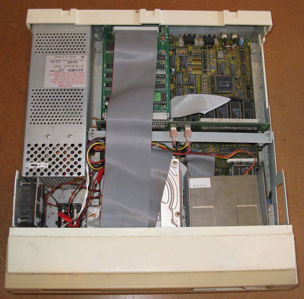 Inside, single floppy drive, SCSI podule in a 4-pod backplane, with SCSI disc drive connected.