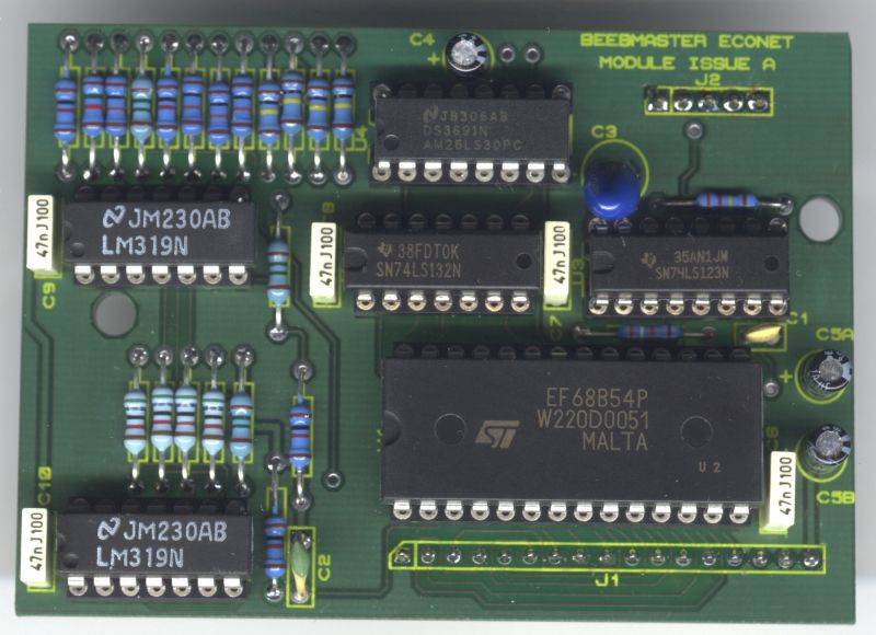 The pictures above show the first BeebMaster Econet Module, with socketed ICs. This was supplied as a test piece. All the remaining pieces had the ICs soldered direct to the board.