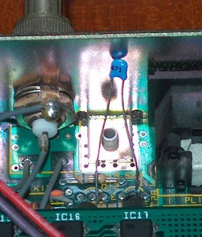 Attach one leg of the capacitor to the Emitter of Q12 and the other leg to the Base of Q13. If you bend the legs a bit, you will be able to get it to sit quite easily in position and lean up against the backplate. For a more permanent application, you can solder it in place.