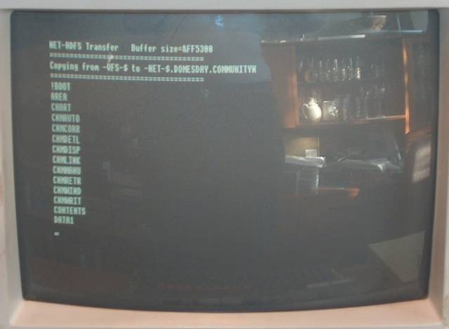 Here I am using a very handy SJ utility, Multicopy, to copy the files. I have made a few modifications to work it with VFS instead of ADFS. The good thing about Multicopy is that, unlike Logcopy, it uses all the available RAM as a buffer. With the ARM Co-processor attached to the Domesday Machine, I have just under 16MB of RAM available, all of which is being used by Multicopy.