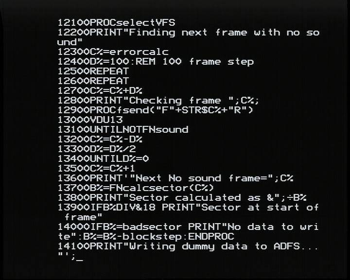 Having found an error, it then switches processes to read the soundtrack information from the current disc frame incrementally until it finds a frame with no sound and whittles it down to the end of the sound sequence, whereupon we assume that the next LV-ROM data section of the disc commences. Having done that, it fills in all the ADFS copy of the disc with dummy data.
