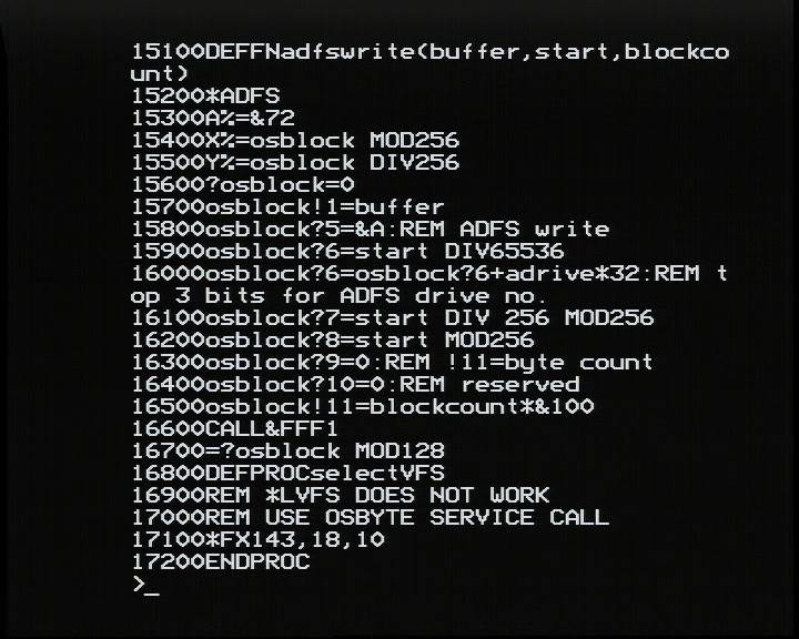 This uses OSWORD call &72 and sends the number of bytes to be written in the parameter block rather than the number of disc sectors. This allows a much larger block of data to be written in one call, because only 1 byte is available in the command block for sector count, but 4 bytes are available for byte count. Finally, the procedure to select VFS is at the end. This is achieved using the OSBYTE service call, although I can't remember why because there are instances of "*LVFS" being used earlier in LVCopier.
