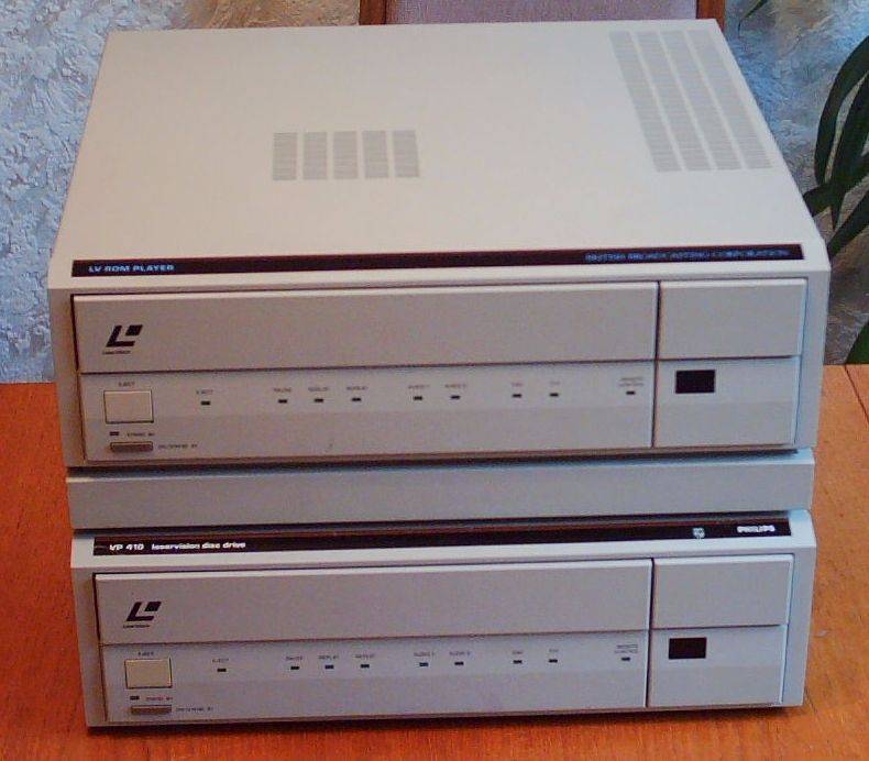 This is the two Laserdisc Players stacked on top of each other. The top one is the Domesday LV-ROM player and it is branded "British Broadcasting Corporation". The bottom one is the Laserdisc Player marked "VP-410 Laservision Disc Drive" and Philips branded.
