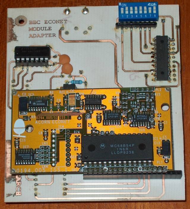 It appears to be a fairly straightforward design, with a set of DIP switches in place of link jumpers for setting the Econet station number.