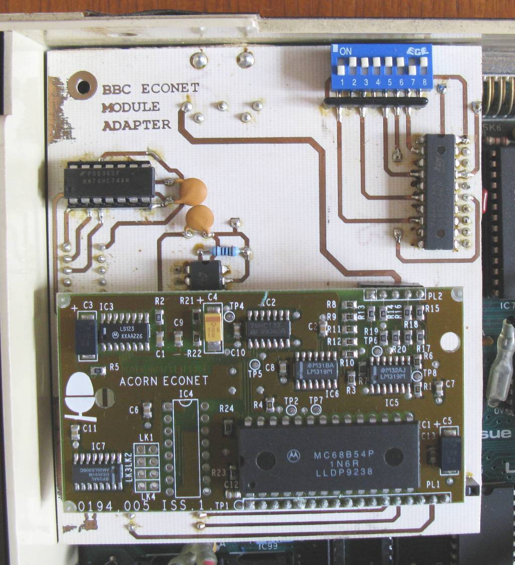 The Special Econet board is designed to plug into the BBC motherboard, and has a bank of links for setting the Econet station number. It does need an Econet module, though, in this case an A3020/A4000 type board has been fitted.