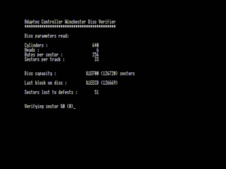 It then performs a verify, operating on a block of sectors at once. The Adaptec Verify command has two bytes for the number of sectors to be verified, so that's up to 65,536 sectors. The trouble with this is that the Beeb is lost to the disc controller whilst this is going on, so we don't get a very instructive display of progress on screen. So (unlike Superform) I get it to verify about 4,096 sectors at a time.