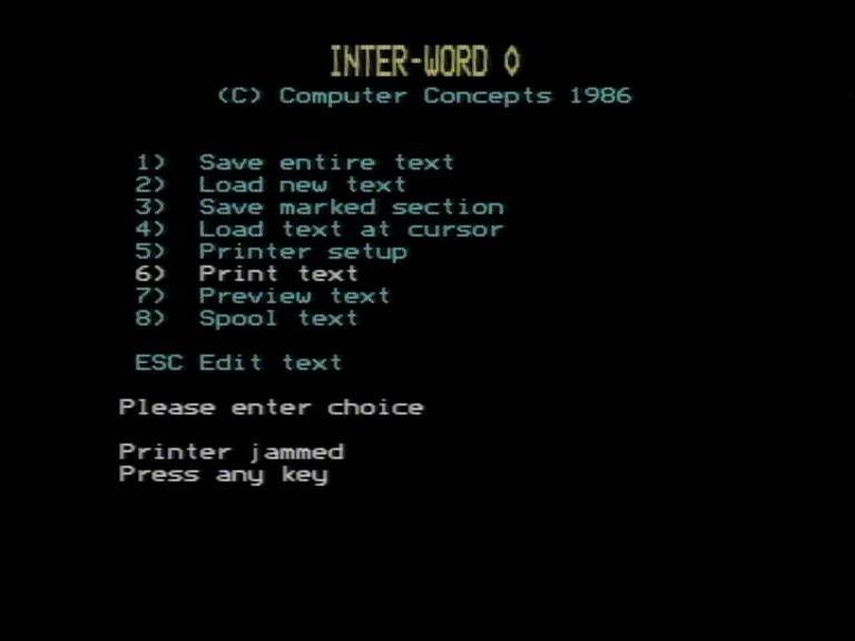 Option 6 prints the document in the current instance of Inter-Word. You may have noticed in some of the earlier screenshots that I had "network printer" selected, rather than parallel or serial. Since I do not have a printer server running on the network, the error shown here occurs.