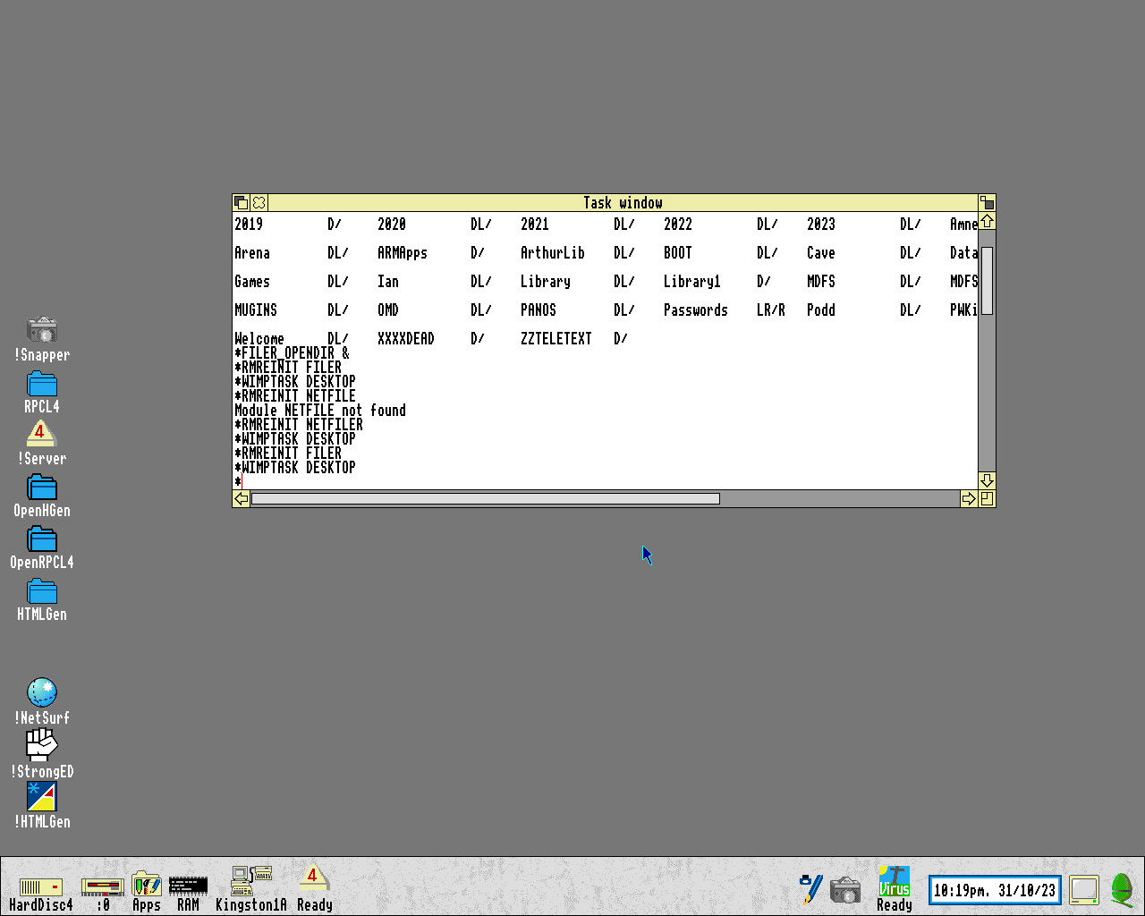 Of course, the first time in this second session, I hadn't also reinitialised NetFiler first, so doing it again restores the Net icon, and still shows the logged-on disc name.