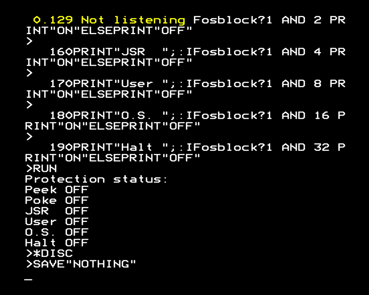 Next, a disc write. I am using Econet to view the screen from Station 129 at Station 201 where I do the capture using RGBtoHDMI and a USB capture stick. My Econet screen viewer reports an error message top left if things go wrong - so here, instead of being able to remotely capture the next screen after a disc write operation, Station 129 stops listening.