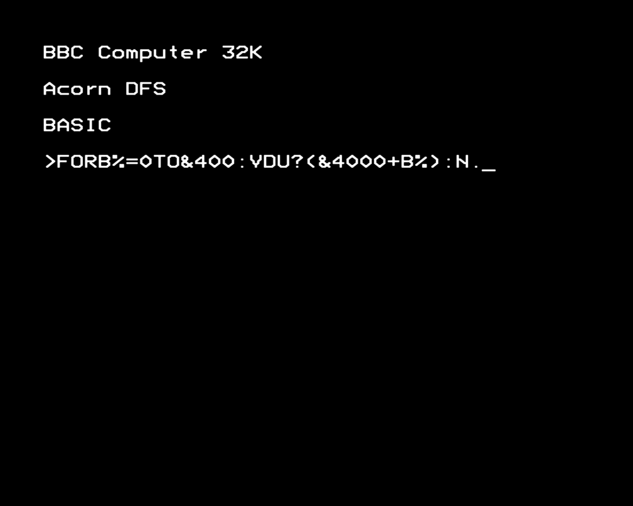 I had to be a bit creative to get the next screen because of this. This copies 1024 bytes from memory location &4000 to screen.