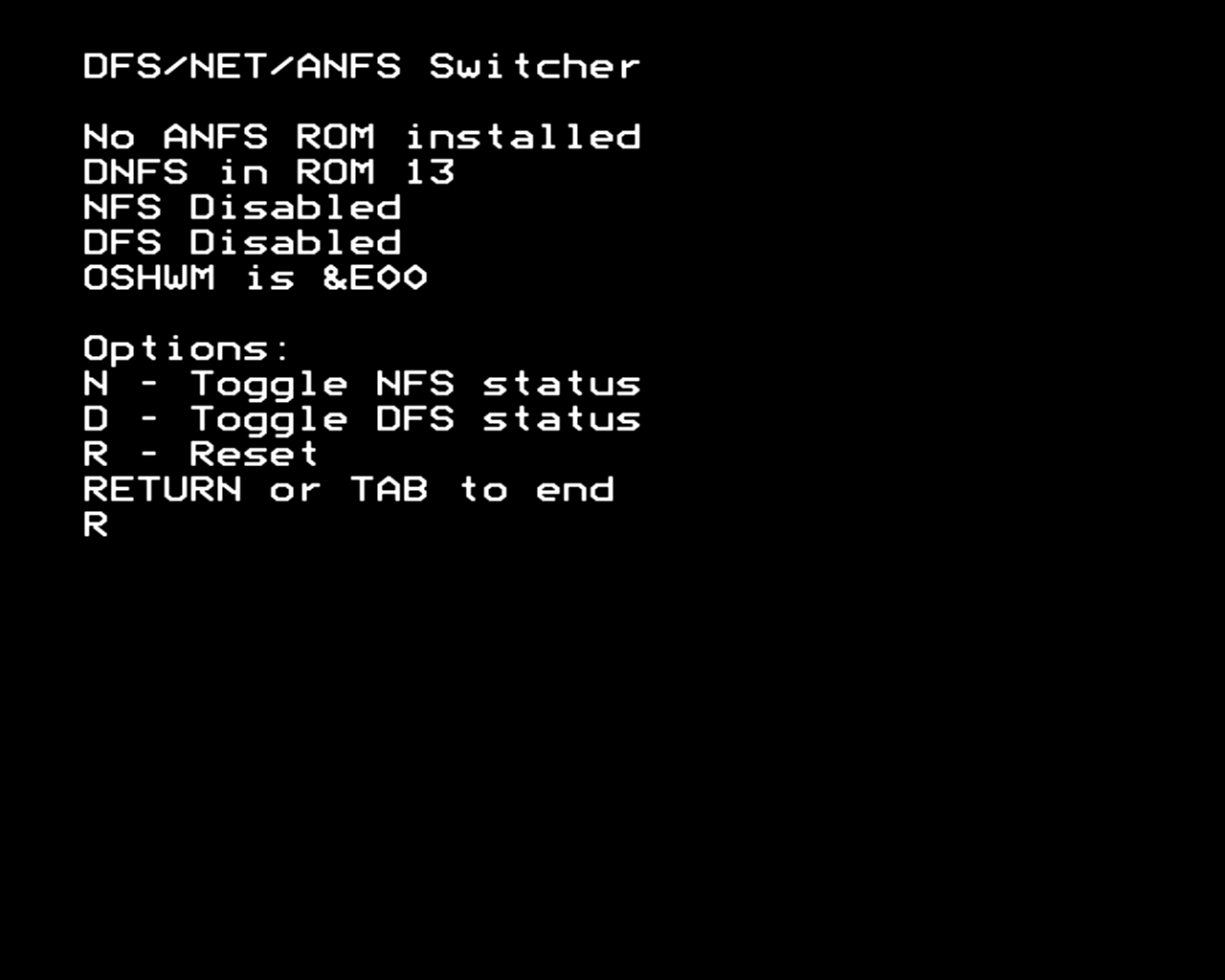 Switcher loads again, and shows that both DFS and NFS have been disabled, and OSHWM is down at the tape level of &E00.