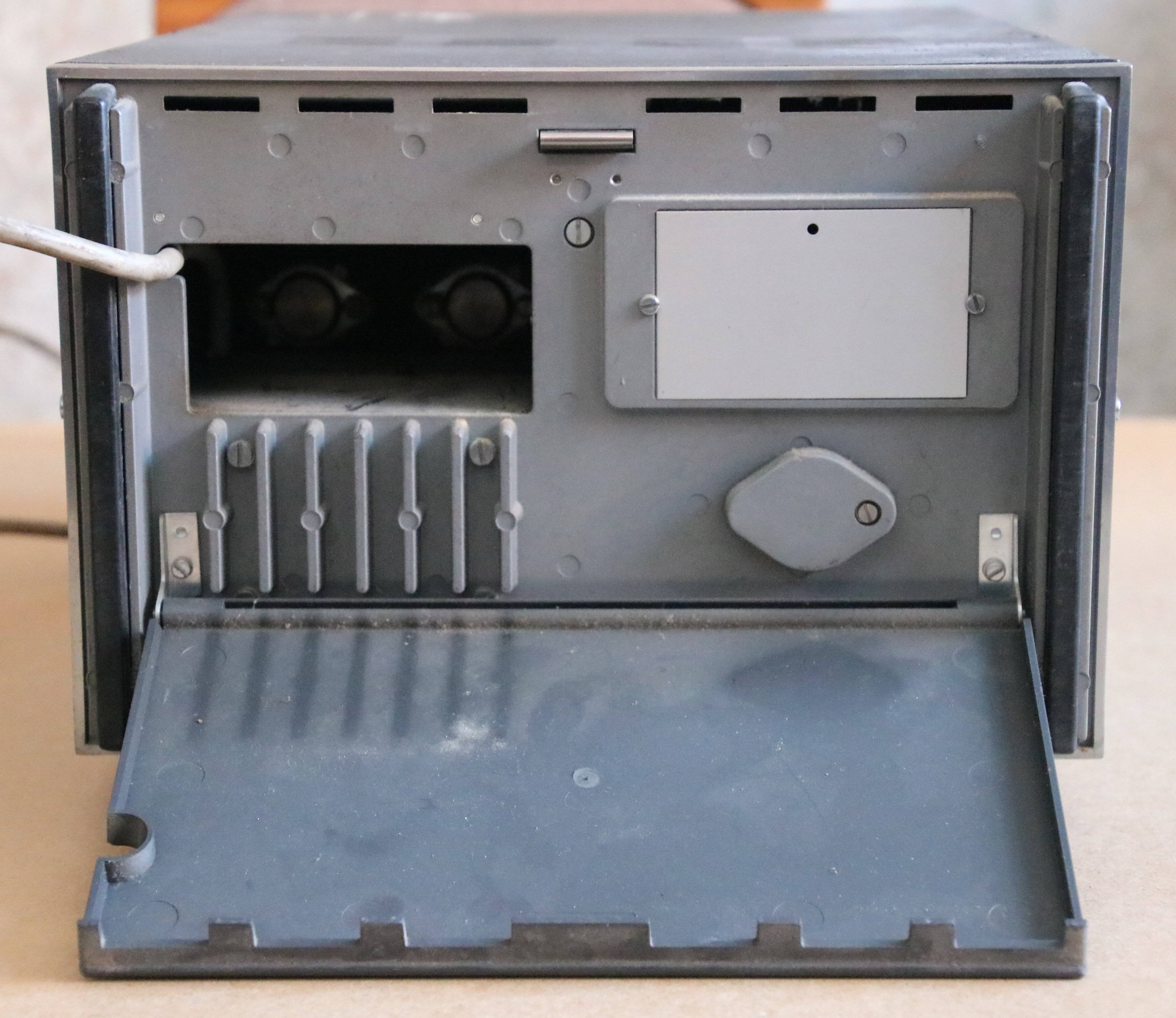 The back panel pulls down, and there's a recess for pushing the power cord inside.