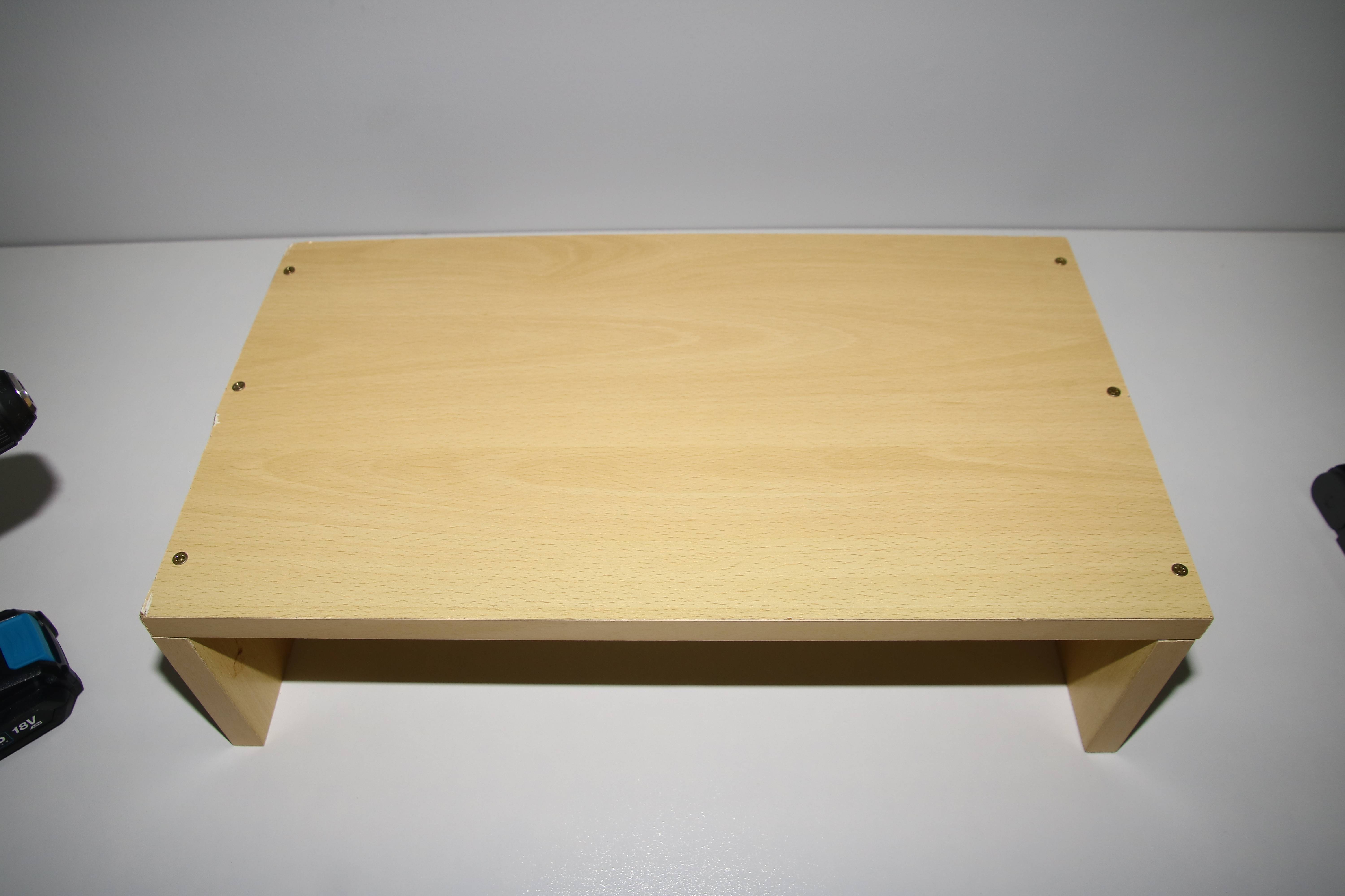 I then assemble the three pieces using my new drill to make screwholes in the top through to the legs, and then screw them together.