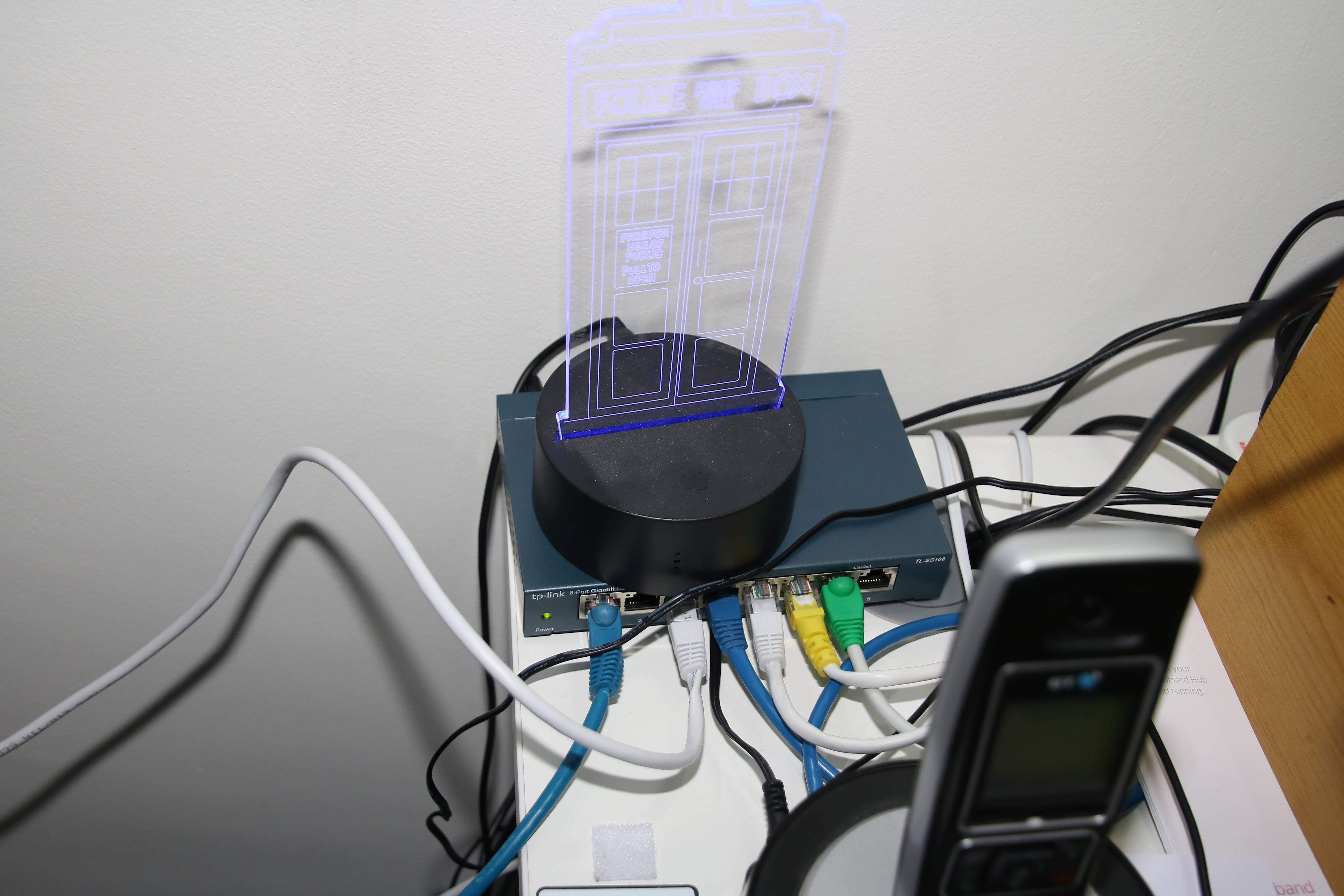 Here's the network switch in the BeebOffice, where the blue network cable comes in from the BeebRoom. This allows me to get pretty much 100% internet speed to my PC compared to having a powerline adatper in this room, which only gave me about 40%.