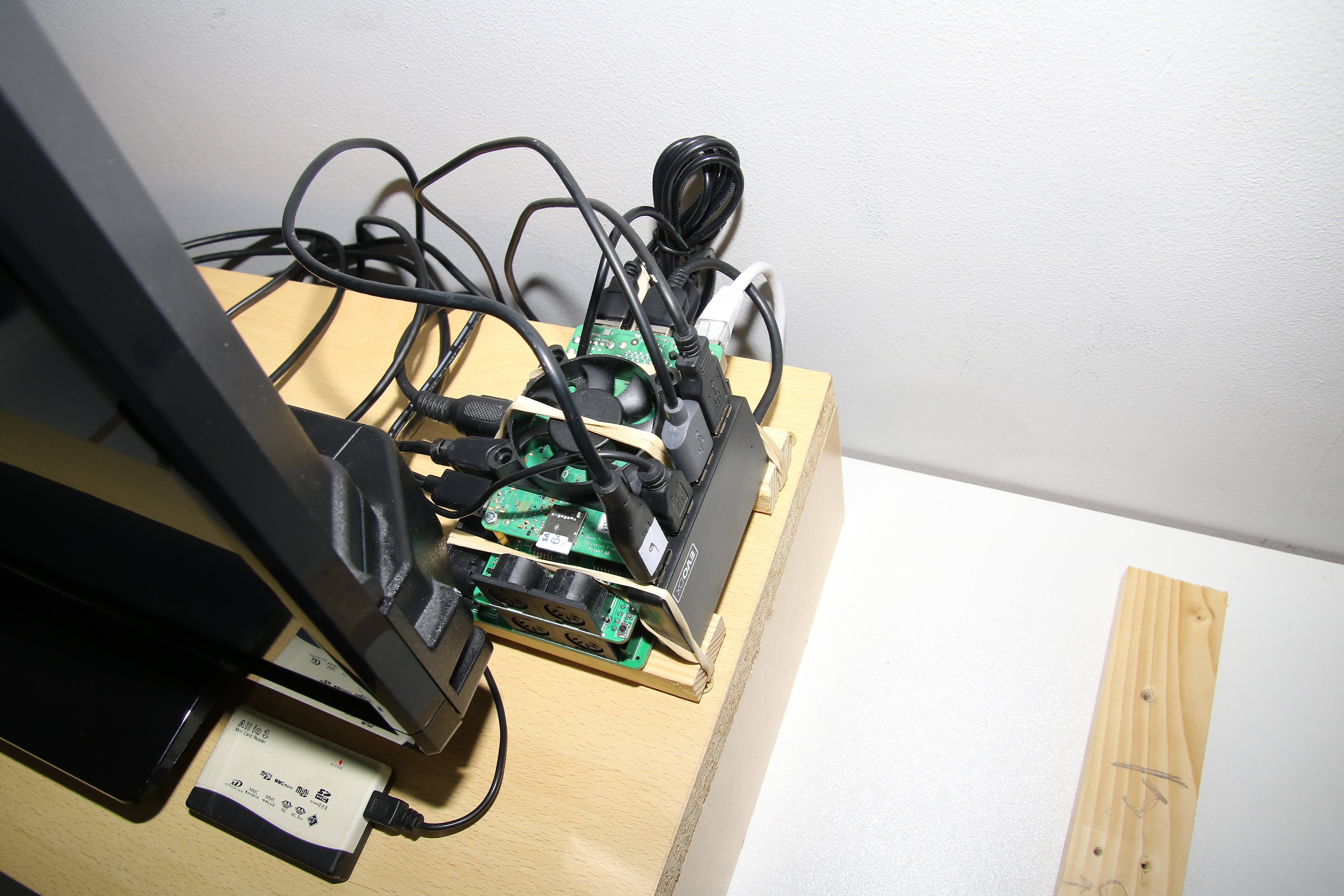 Next, I have made some changes to the Pi itself. I have reinstated the Econet hub, connected a USB hub, and added a 5V USB fan to keep it cool. It is mounted on two bits of balsa wood and strapped together with elastic bands.