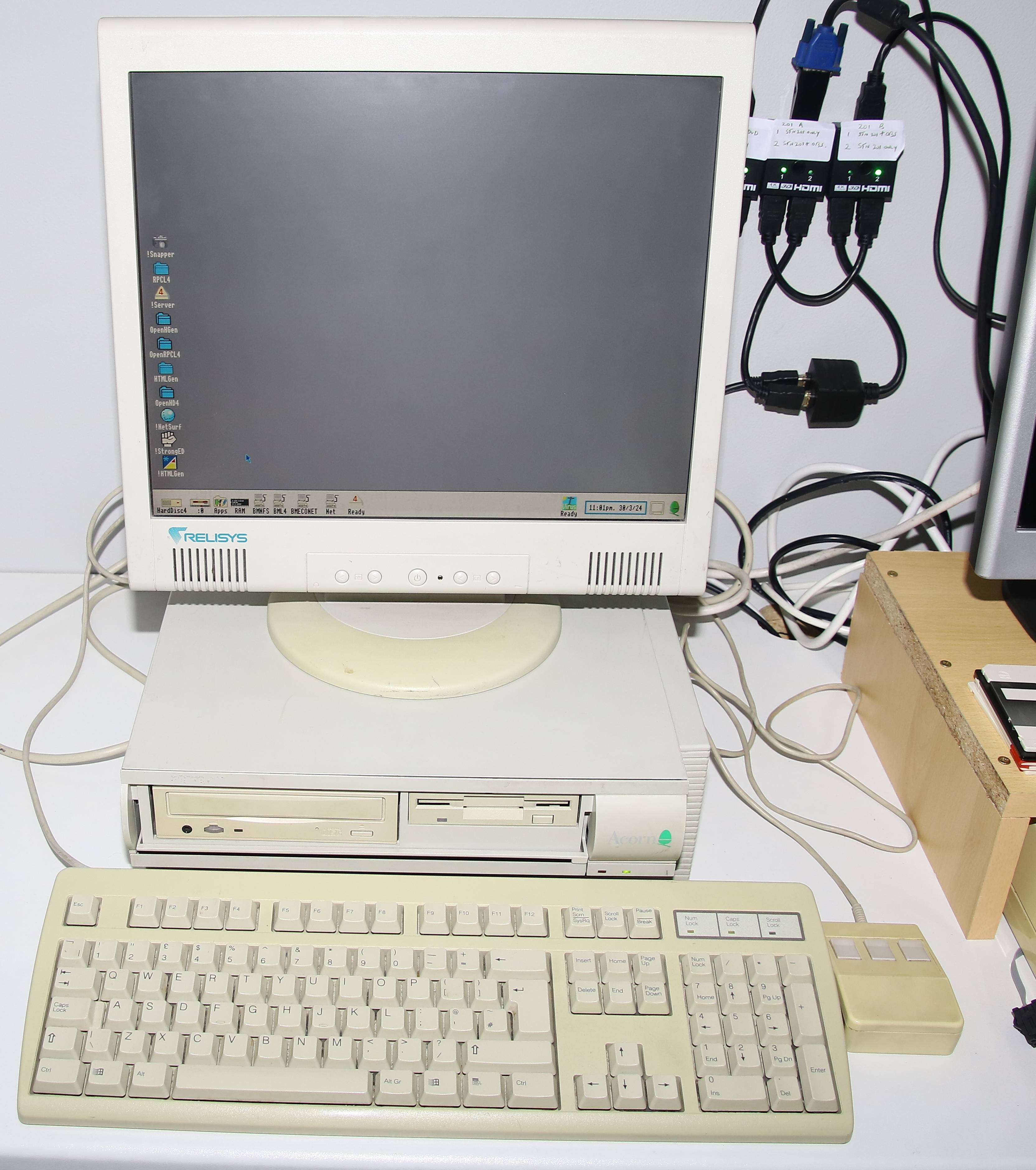 With the extra bench length, I can add more machines, and for the first time a 32-bit Acorn graces the new BeebRoom: my RISC PC 700.