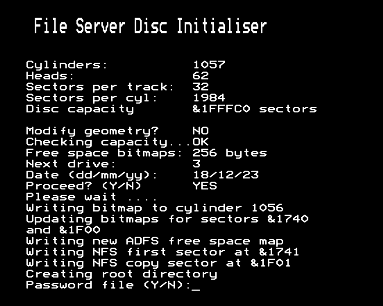 After it has written the free space bitmap to each cylinder, it finishes the job and asks if a password file is necessary.