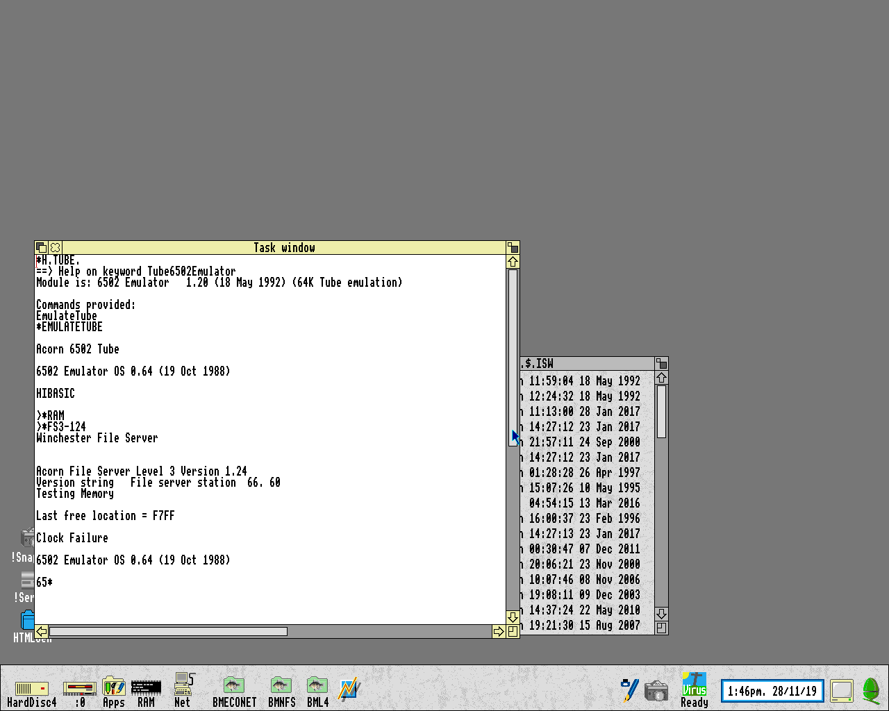 This follows on from my attempt to run the L3 server using the newly-discovered 256K 6502 second processor emulator. Here we are using the standard !6502Tube emulator, and file server version 1.24. It doesn't work because it can't detect the clock dongle.