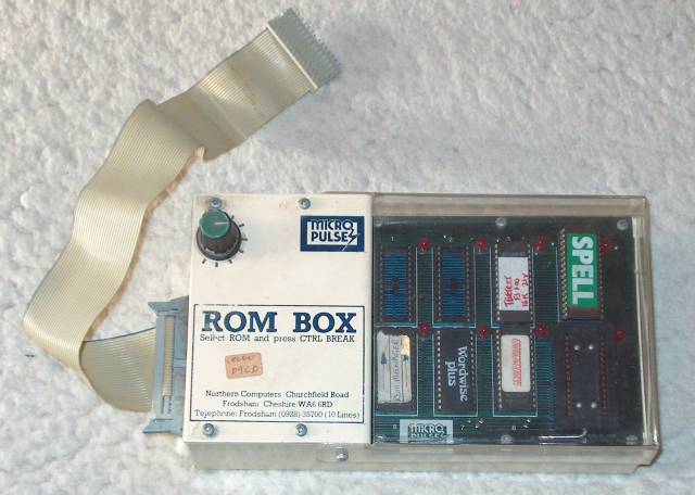 Here we can see all the main features of the ROMBox: the connecting ribbon cable, the dial for switching ROM, the 8 sockets and LED lamps and the protective plastic cover of the box.