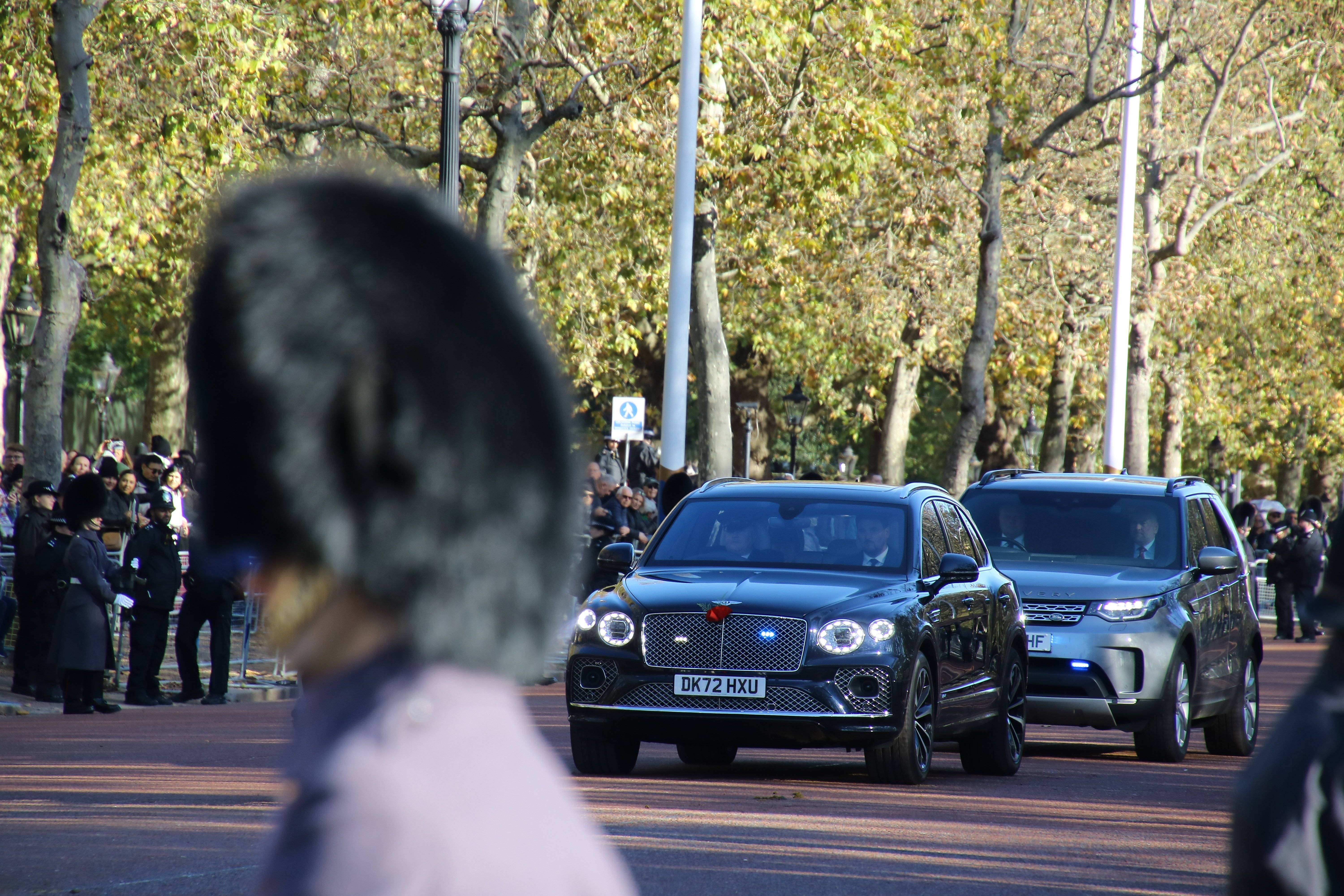 A few minutes later, a Poppy festooned Bentley of the Royal Mews drives to Buckingham Palace.