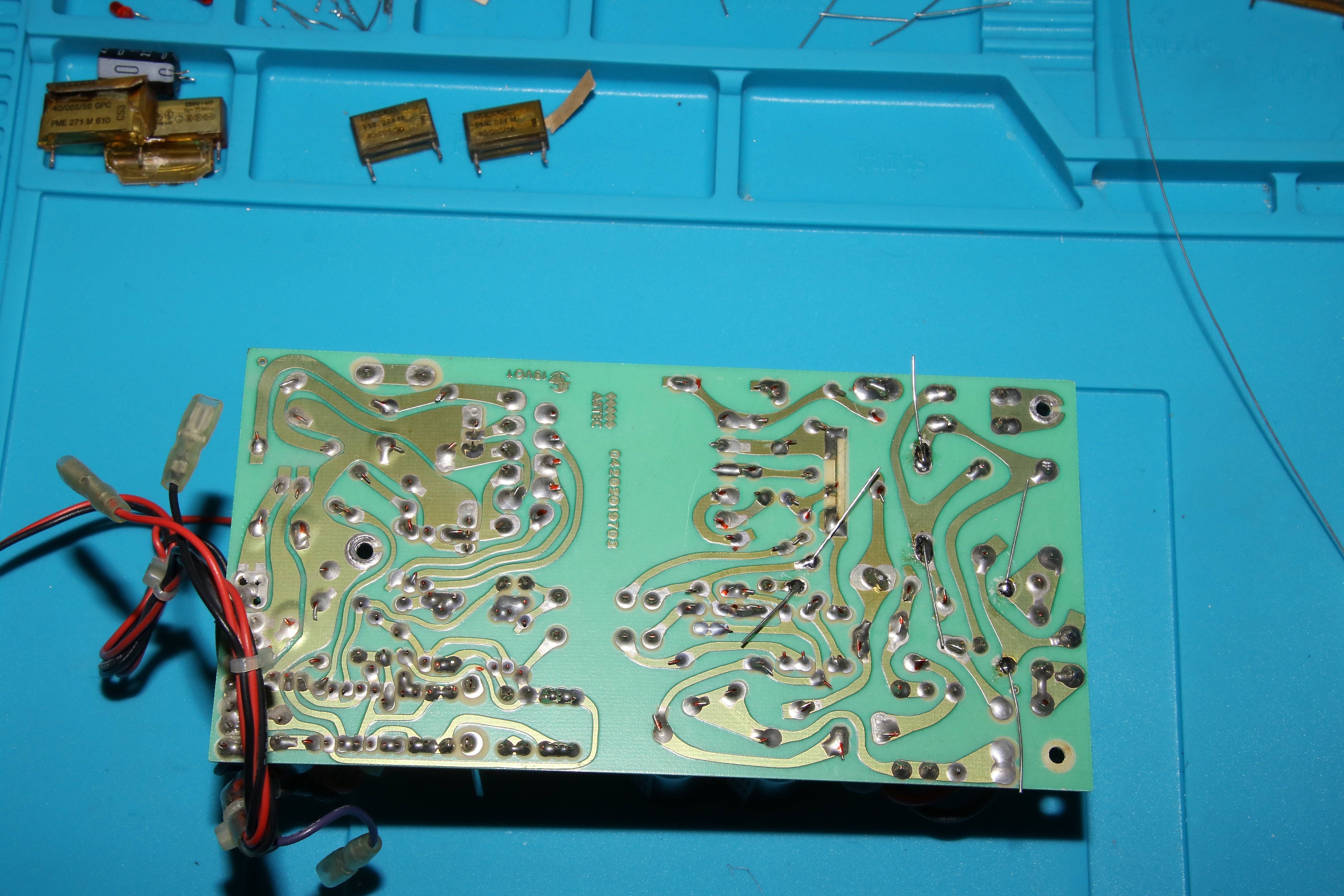 C1 and C2, the X2 capacitors, out along with C9, and new ones in place just awaiting the spare lead lengths being clipped.