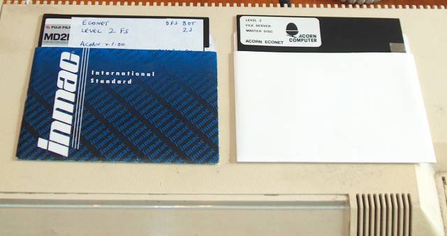 In addition, you will need a disc drive and the Level 2 File Server software disc, shown here on the left, and a data disc. The original Acorn Level 2 "Master" data disc is shown here on the right which contains the Econet library utilities.